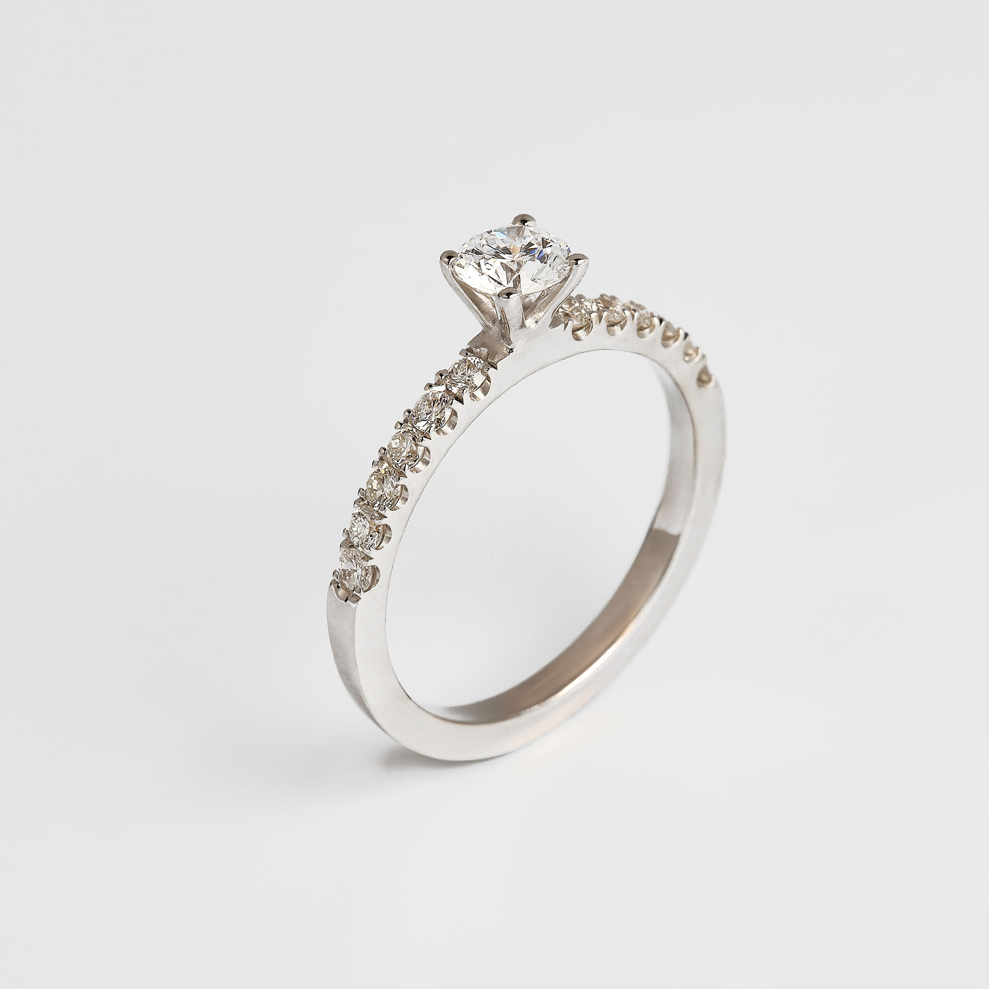 Este elegante anillo de compromiso presenta un diamante central de 0.36 quilates que capta todas las miradas por su brillo y pureza. Acompañado por diamantes laterales en el aro, con un peso total de 0.26 quilates, ofrece un resplandor envolvente que realza su diseño sofisticado y atemporal.