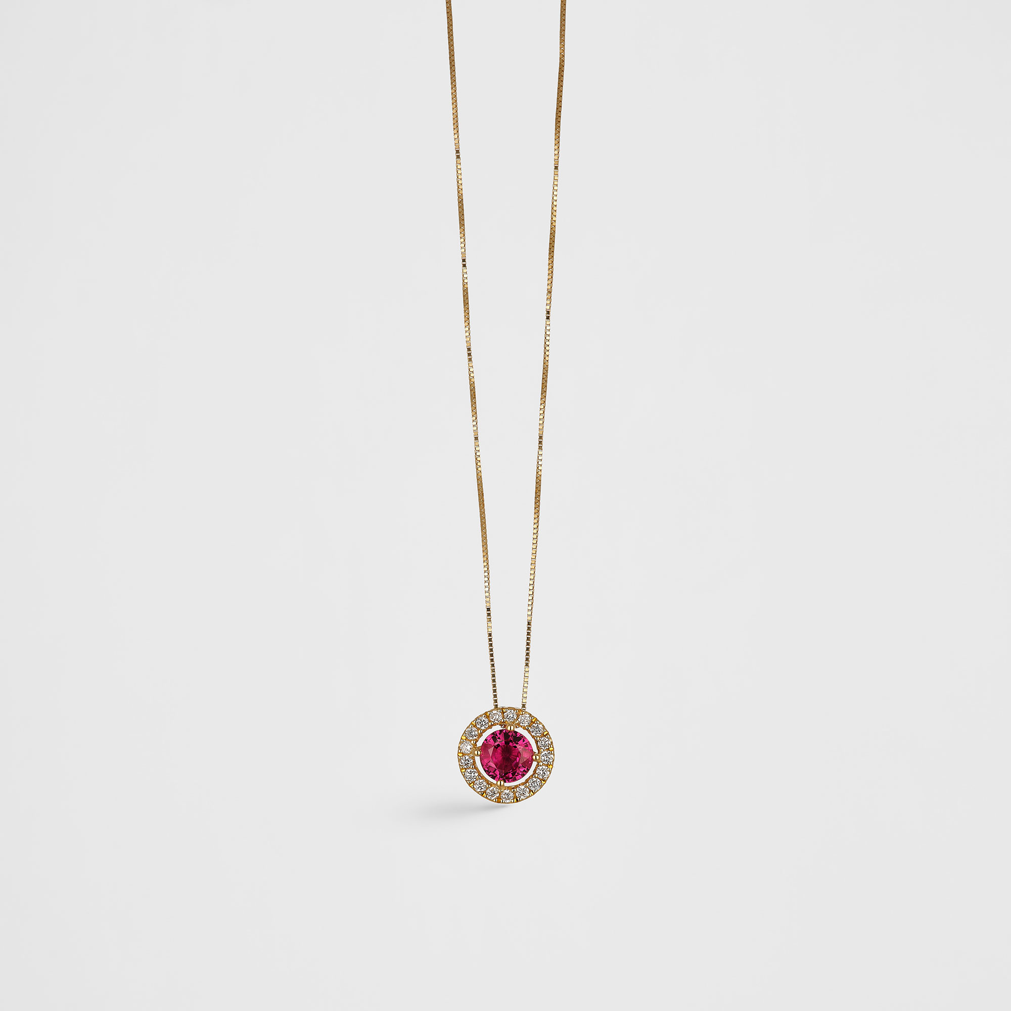Cadena con Dije Rubí Top Quality 0,83 ct – Halo de Diamantes 0,20 ct en Oro Amarillo 18k