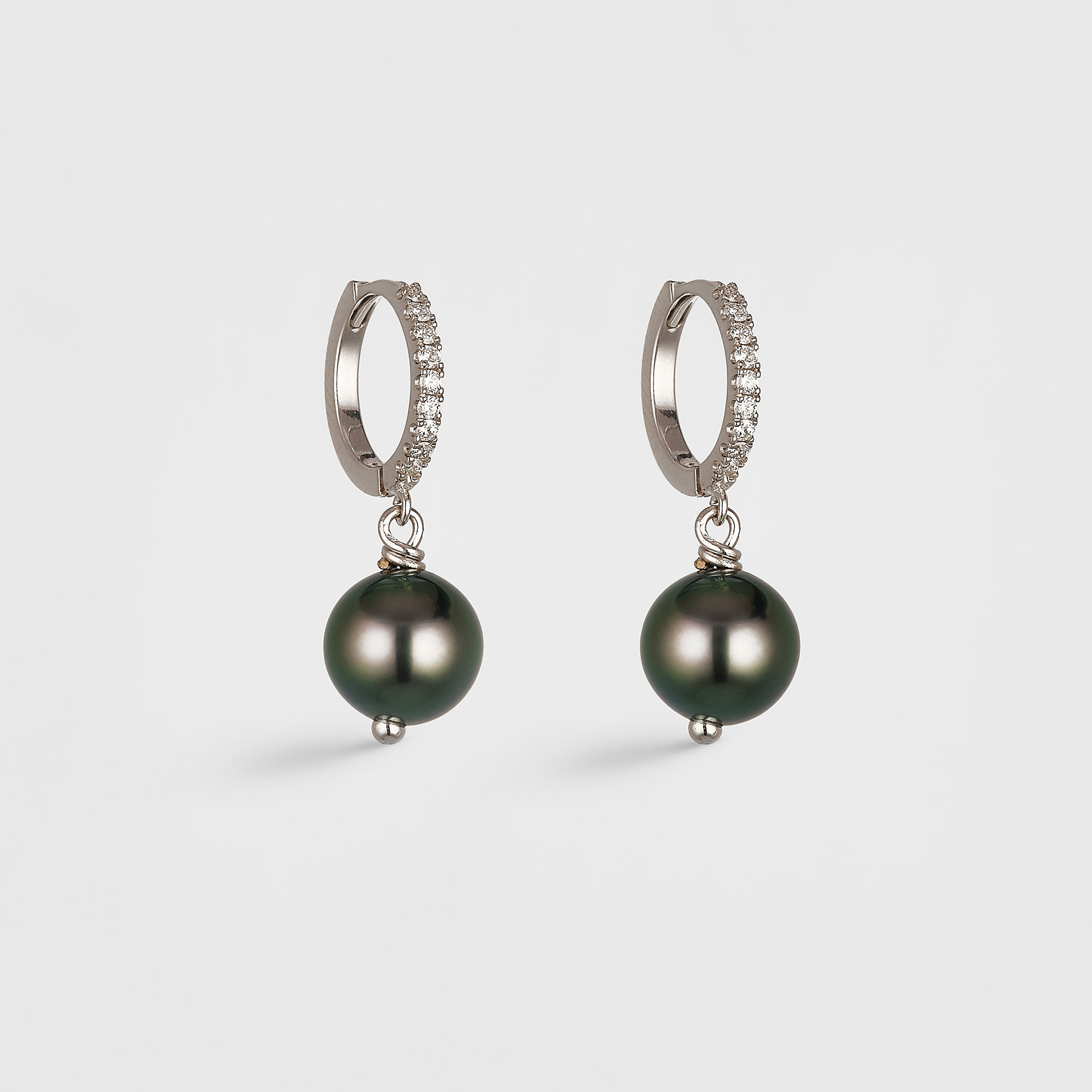 Sofisticación con un aire misterioso. Estos aretes tipo candonga destacan por la presencia imponente de perlas negras de 8,9 ct, conocidas por su brillo exótico y tonalidades profundas. Acompañadas de diamantes naturales de 0,18 ct, cada detalle resalta su elegancia única.