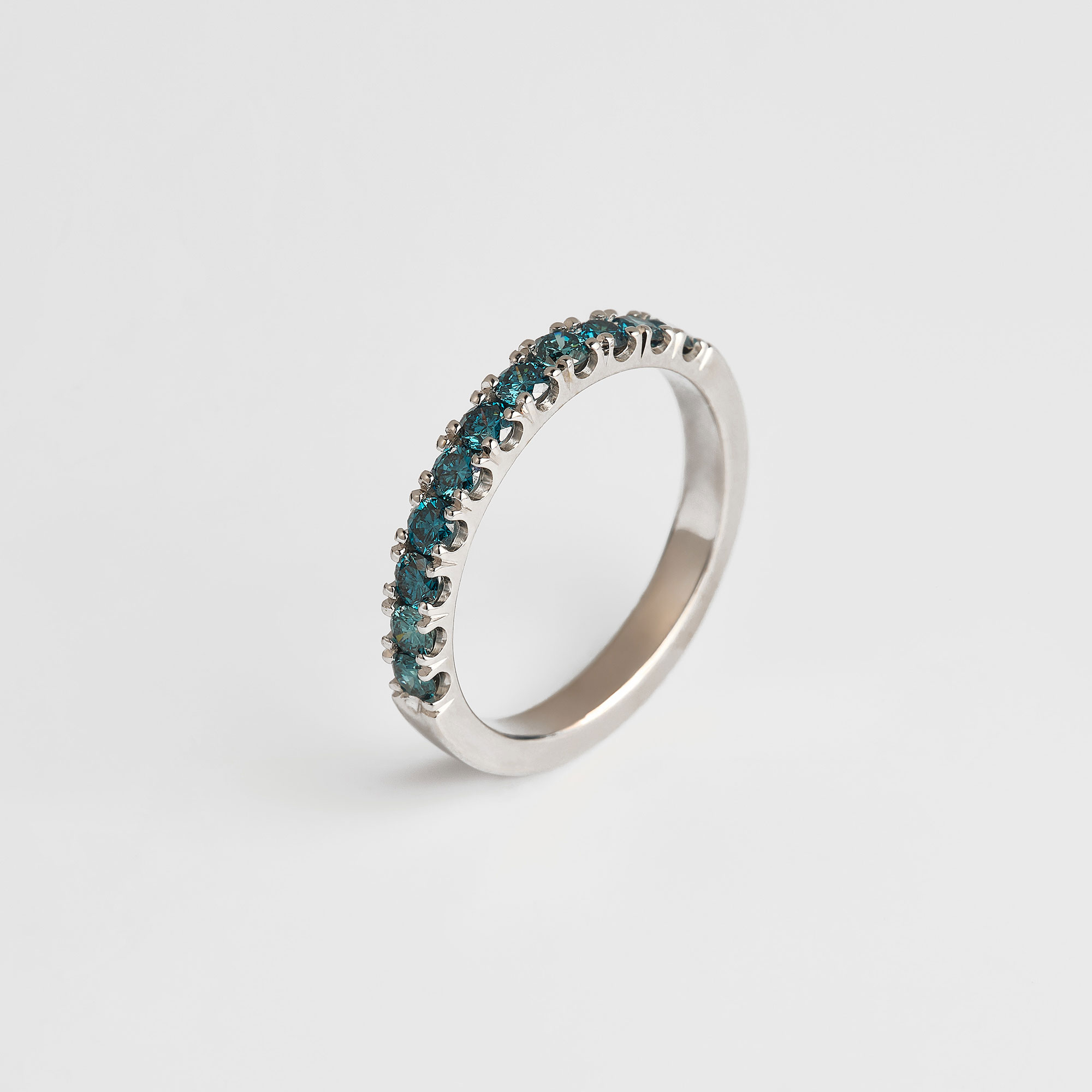 Diseño clásico con un giro de color y distinción. Este anillo tipo cintillo está engastado con diamantes azules naturales de 0,56 ct, ofreciendo un brillo cautivador y moderno sin perder su elegancia atemporal.