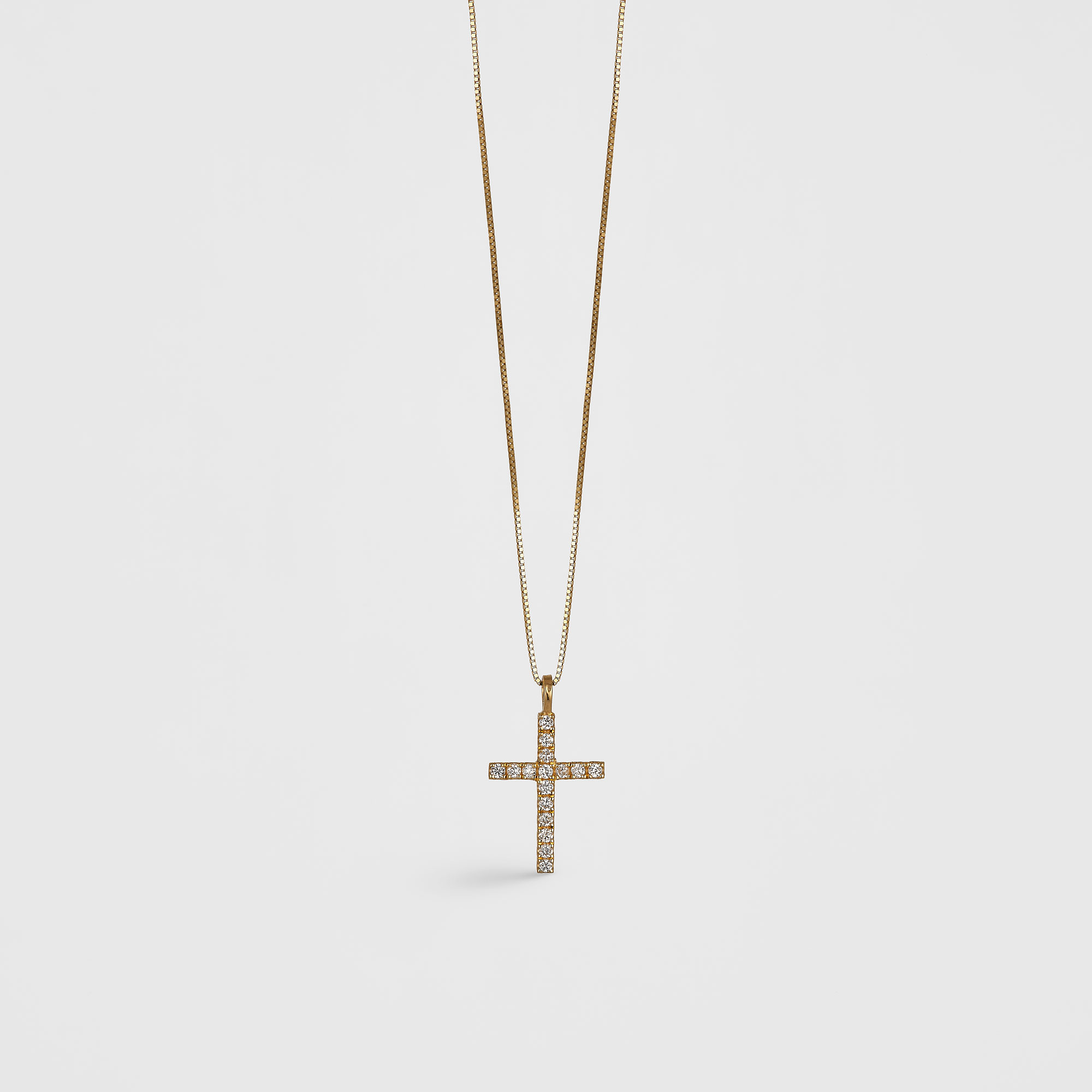 Clásica, espiritual y luminosa. Esta cruz de 1,5 cm está delicadamente engastada con diamantes naturales de 0,16 ct, que aportan brillo y elegancia a su diseño atemporal.