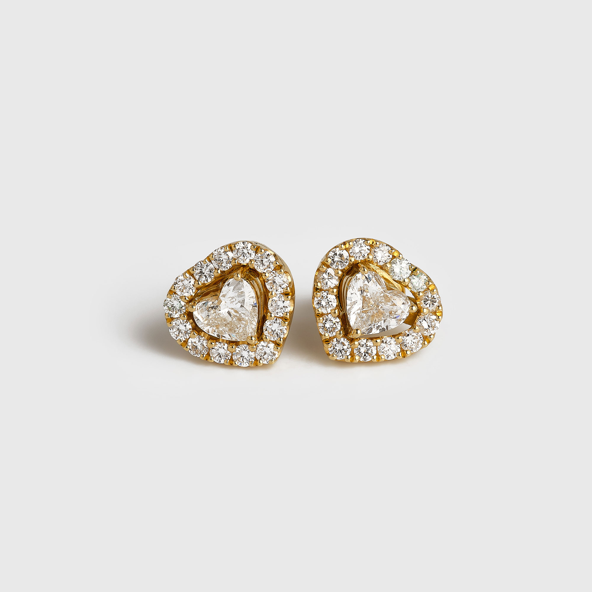 Románticos, brillantes y llenos de carácter. Estos exquisitos aretes tipo topo en oro amarillo de 18k presentan diamantes en corte corazón de 0,93 ct, símbolo de amor eterno, rodeados por un deslumbrante halo de diamantes naturales de 0,62 ct que realza su forma y brillo con elegancia.